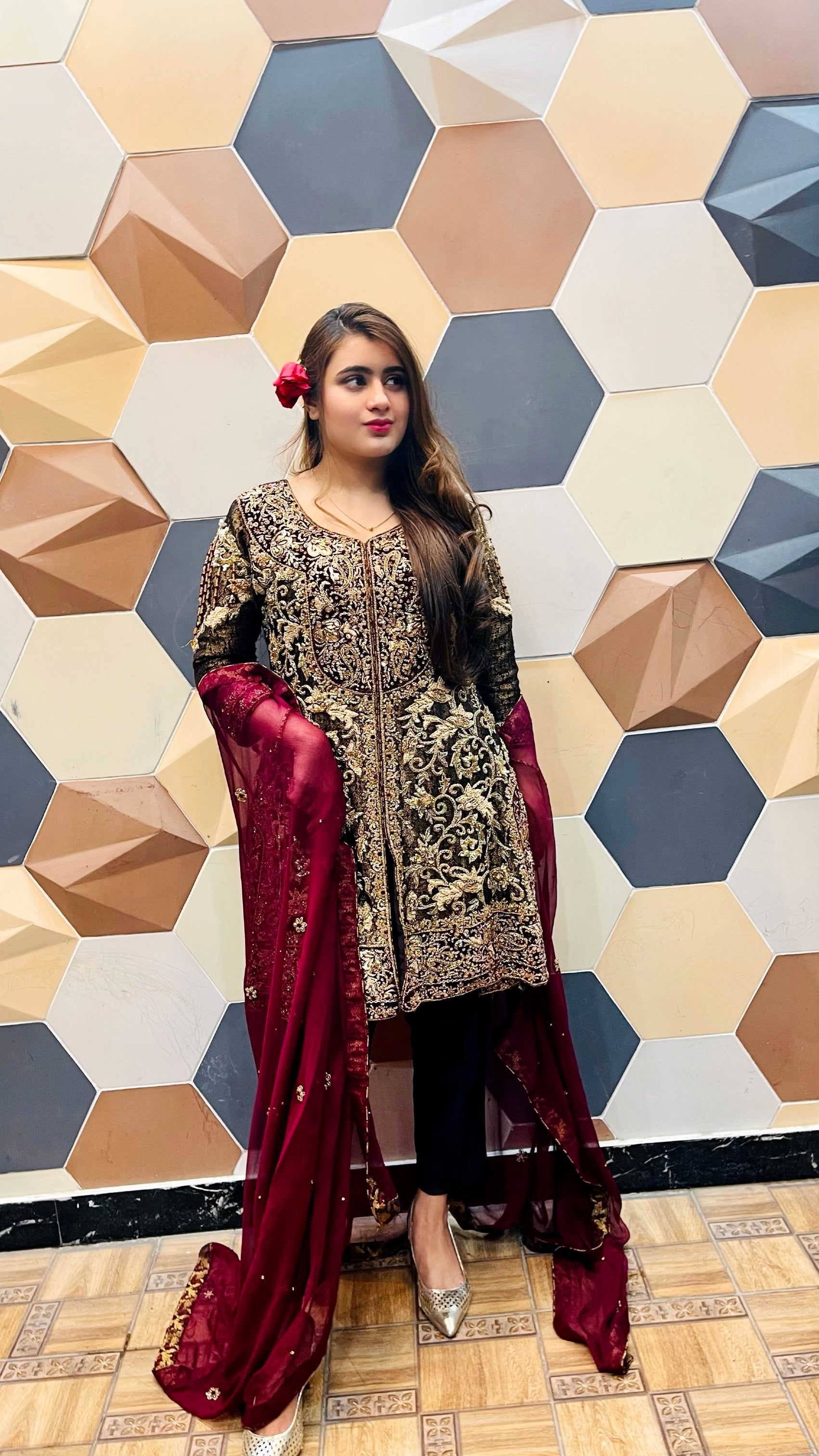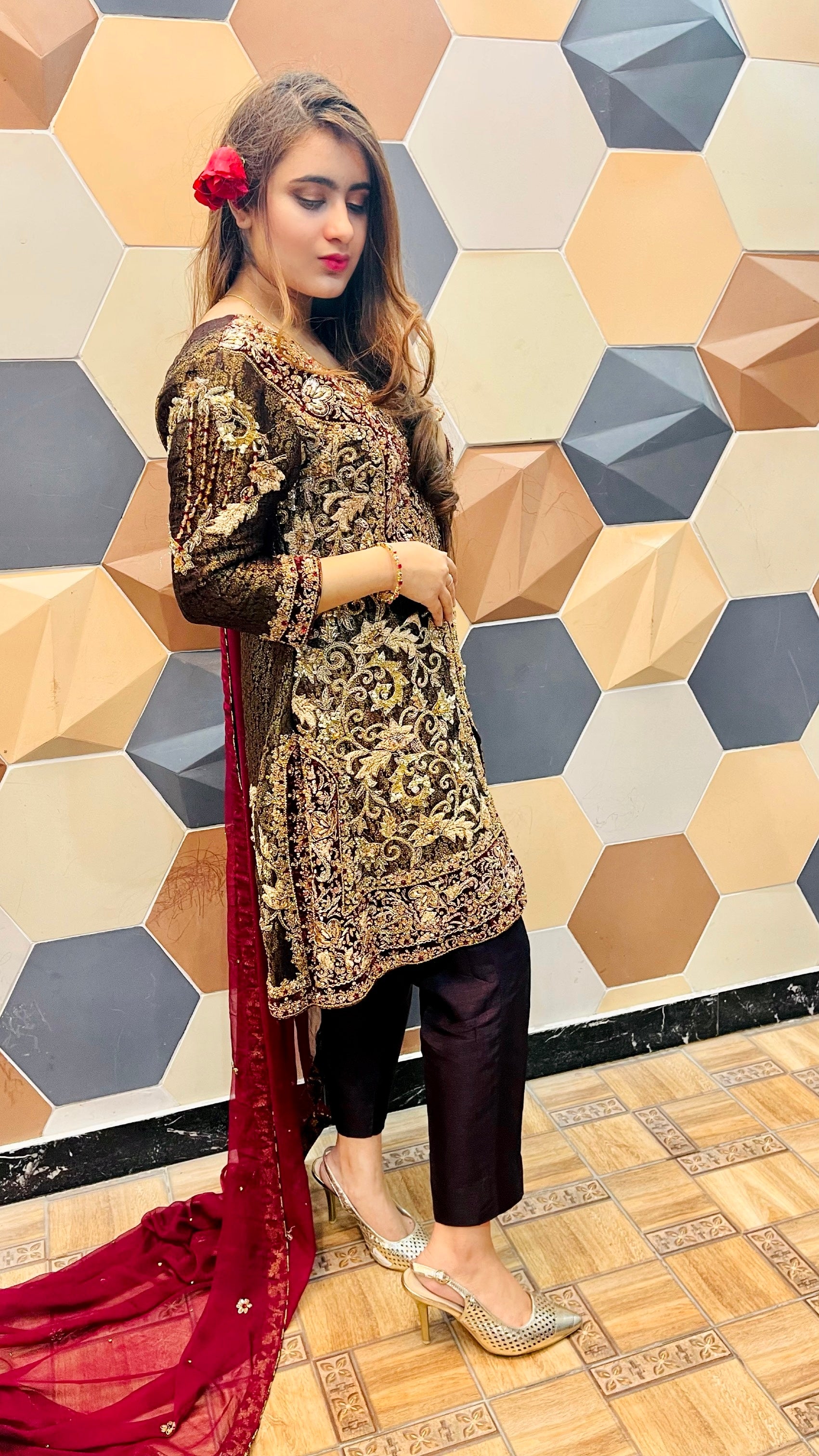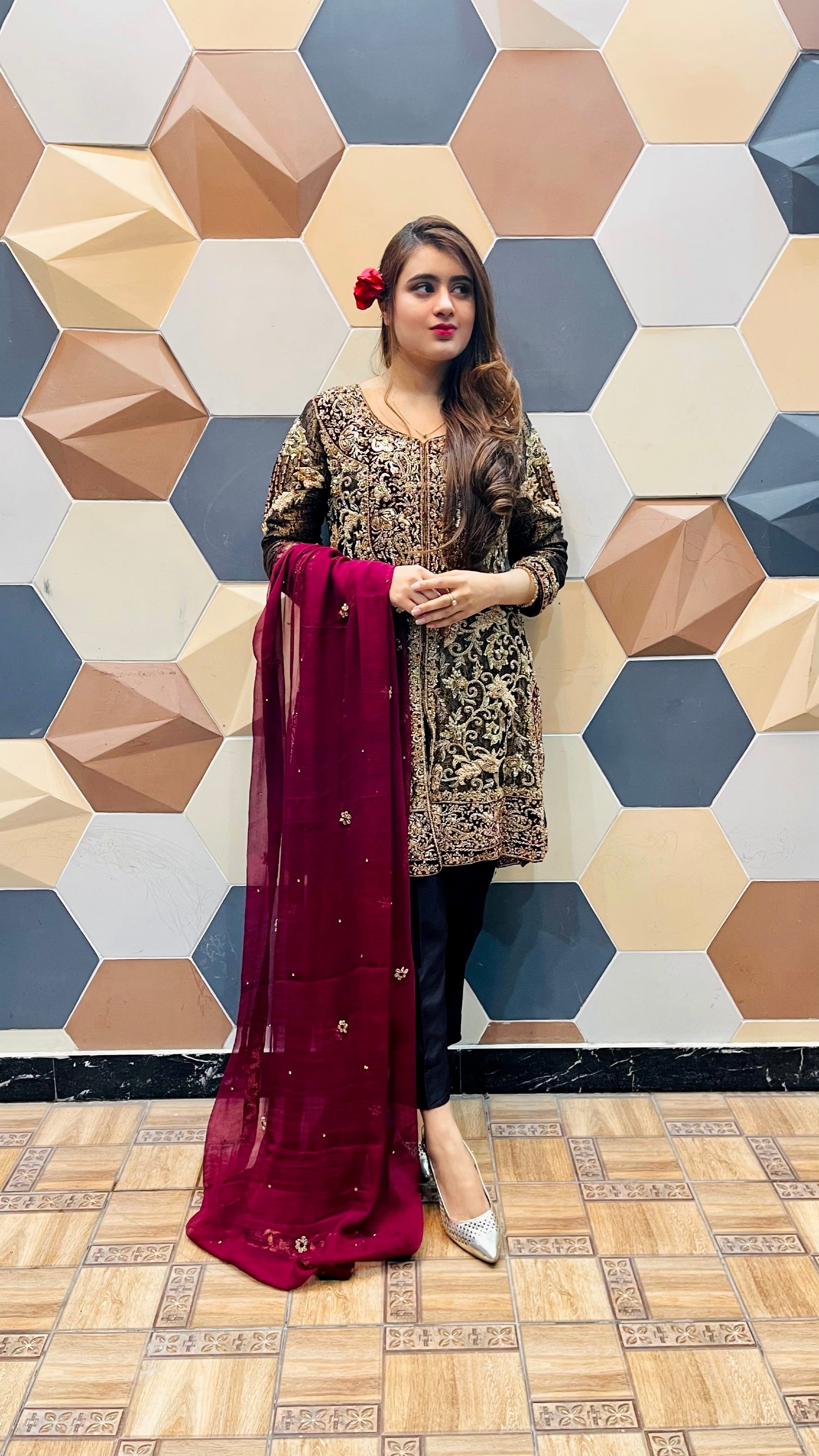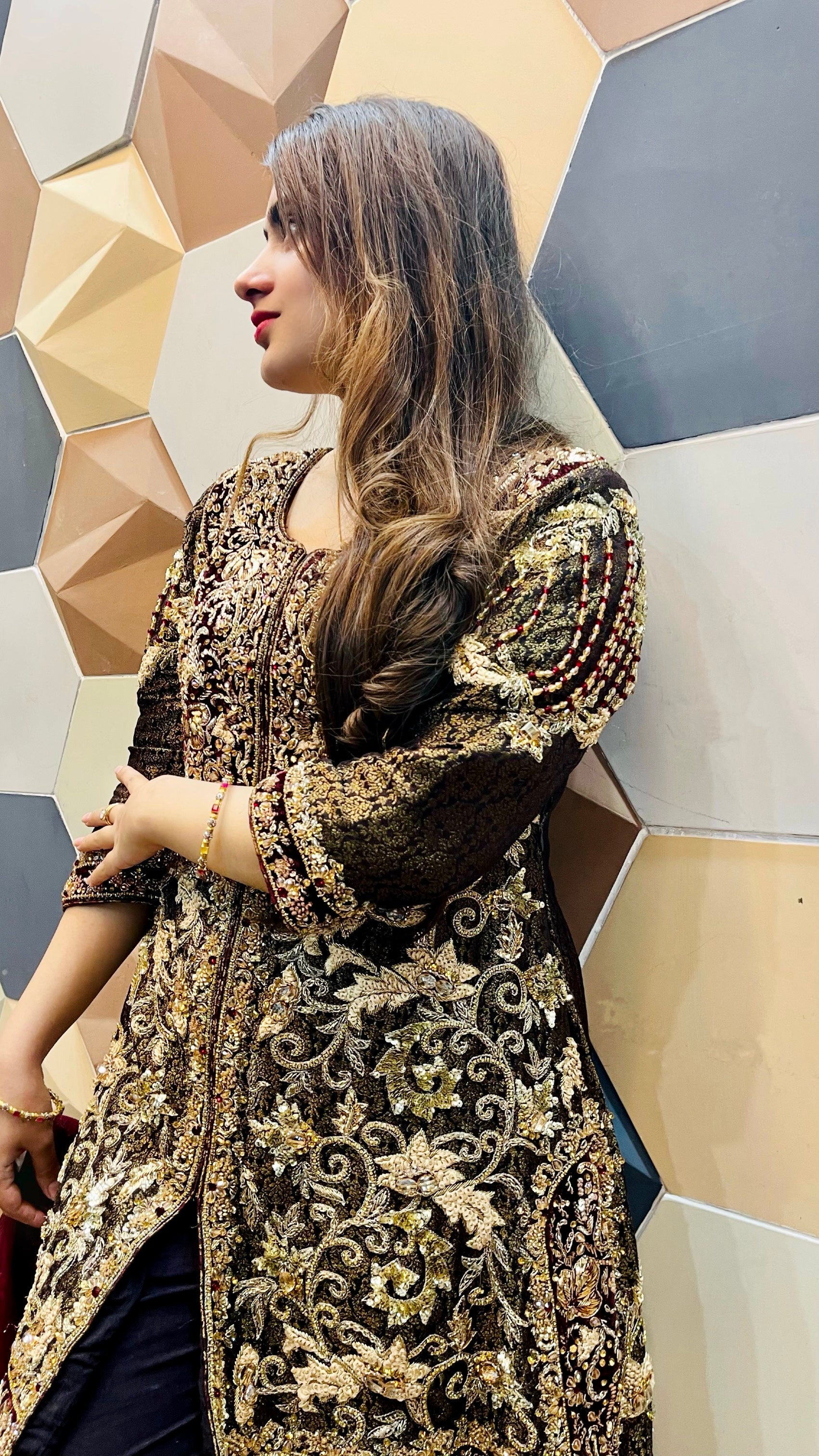 Guzel” is our most heavy embellished outfit of this collection. The shirt fully embellished in floral pattern with the dabka, sitara, moti, zardozi and salma work on pure jamawar fabric. The silhouette of this shirt is A-line. The back also embellished as well. The dropping line of beads on sleeved and back gives the beautiful look to the outfit. The shirt paired with the straight raw silk pants. To complete the look of the outfit, chiffon dupatta added with motif spray on the dupatta. This elegant and gorgeous outfit is perfect for your evenings!